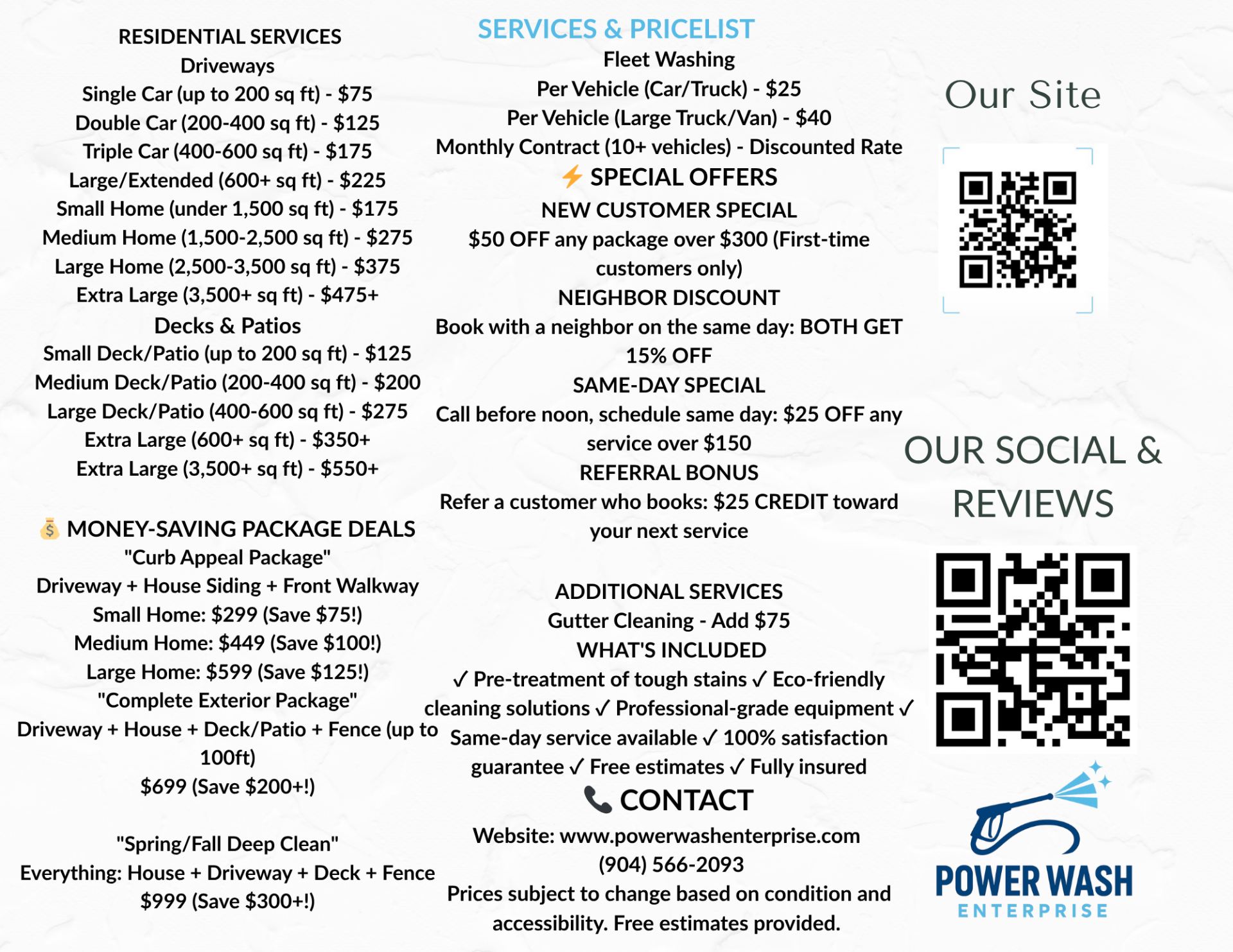 Jacksonville, FL and surrounding areasTrusted by over 500+ homeowners and businesses across Jacksonville, Orange Park, Ponte Vedra Beach, and surrounding areas. Transform your property with professional cleaning services. Licensed, insured, and locally owned since 2015.